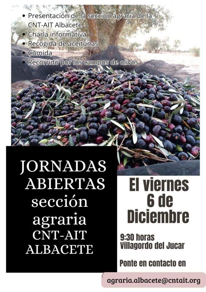 Desde la Sección Sindical Agraria de CNT-AIT de Albacete hemos organizado unas Jornadas de Puertas Abiertas, donde presentaremos la Sección, y donde se podrá conocer nuestro trabajo y organización en este proyecto que venimos desempeñando desde hace 2 años.
