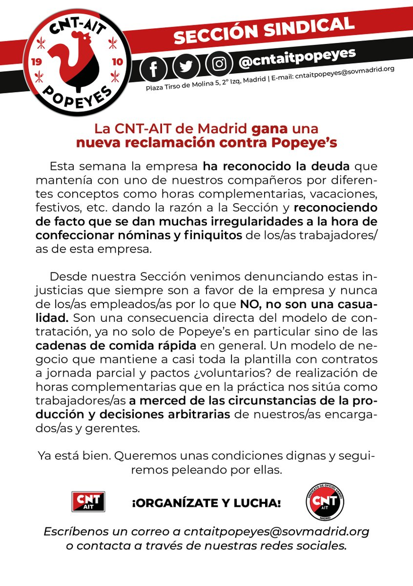 CNT/AIT-IWA Posted on 6 de febrero de 2025 por comunicacion Las compañeras de CNT-AIT en Popeyes obligan a la empresa a reconocer sus irregularidades y esta se ve obligada a pagar por ellas. La resignación frente a los explotadores es un error. La lucha es el único camino. correo imprimir compartir compartir compartir compartir compartir compartir