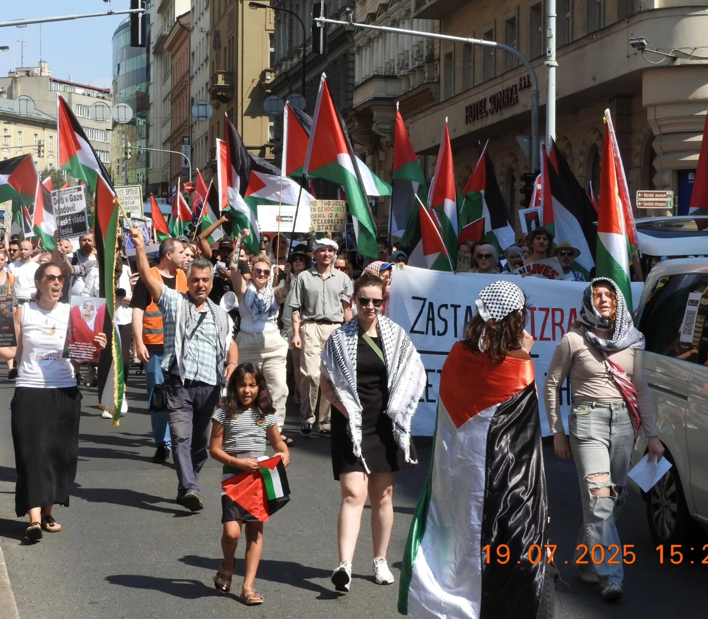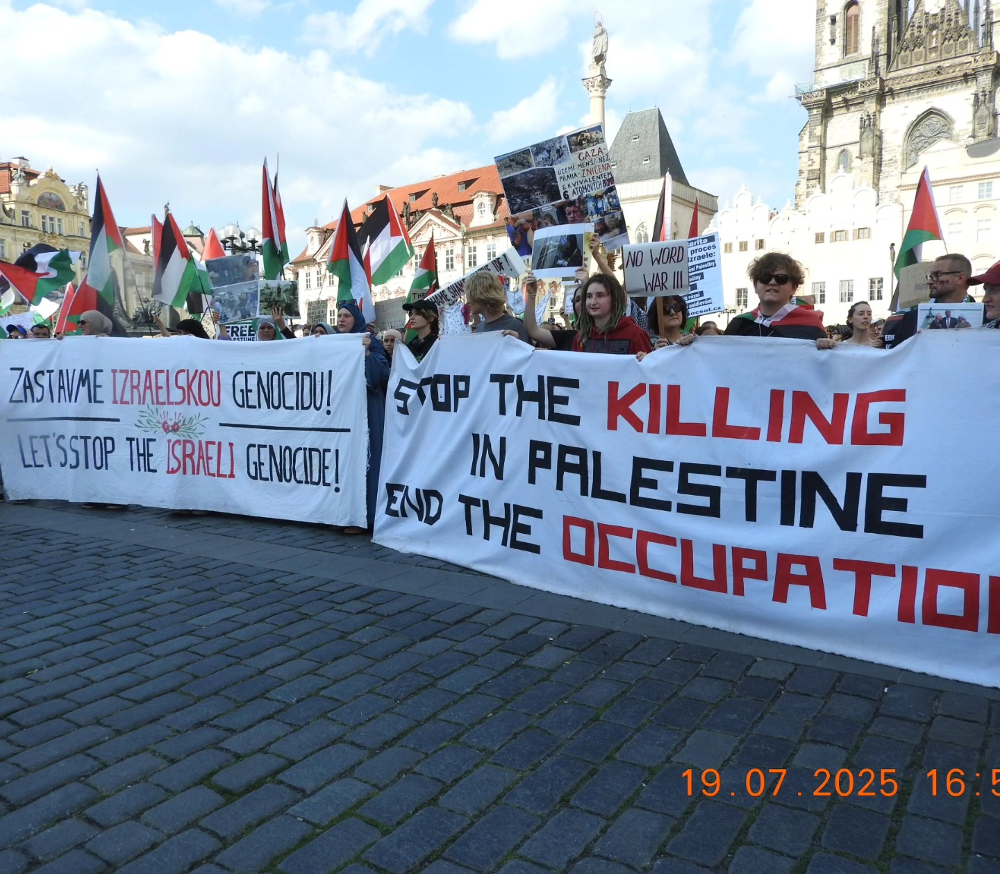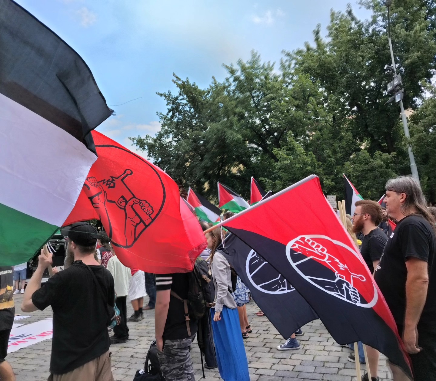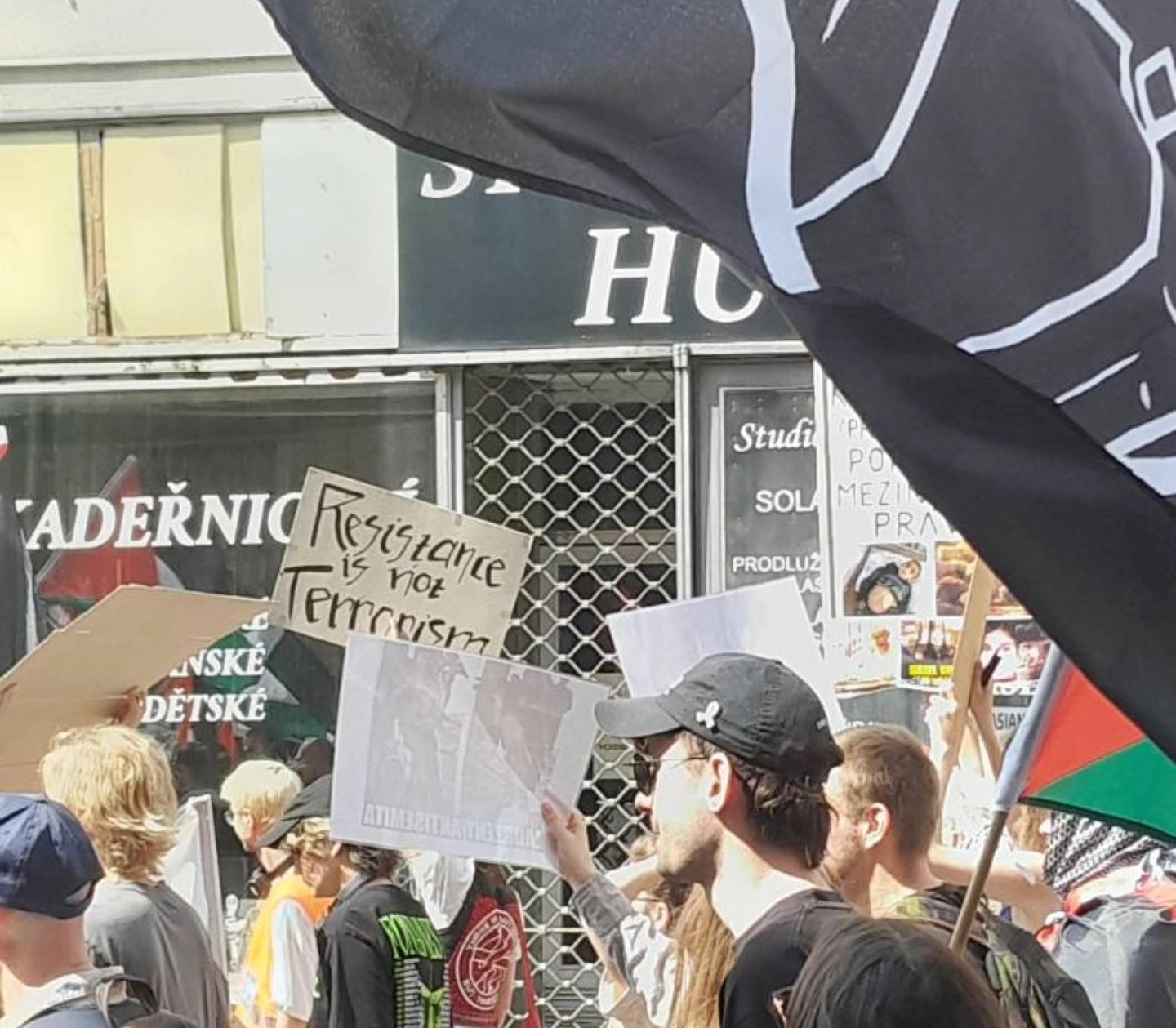 En la Plaza de la Paz escuchamos varios discursos en checo e inglés, mientras tanto varios de nuestros miembros dieron la vuelta a los participantes del evento y repartieron más de 250 piezas del nuevo número especial de Desertéra. Después de la media treinta, se formó el frente de los desfiles y se fue a una marcha por las calles de Praga. Se terminó en la Plaza Wenceslao. El desfile tuvo su energía inconfundible y a lo largo del tiempo, los cantos de las contraseñas se alternaban en checo e inglés. Nos gustaría tomar este camino para agradecer a todos los que escucharon nuestro llamado y vinieron al evento para decir NO a la guerra y a los asesinatos en Palestina. No dudes en ir a más manifestaciones regularmente, mostrar solidaridad con el pueblo palestino y el movimiento israelí anti-guerra, gritar contra la guerra y hablar de ello con tus amigos, colegas y compañeros de clase. Recuerde que podemos detener la guerra -con la resistencia desde abajo- aquí en casa y en Israel y la propia Palestina. Por lo tanto, apoya el movimiento allí. Nos vemos en la próxima manifestación en Praga, Brno o Bratislava.