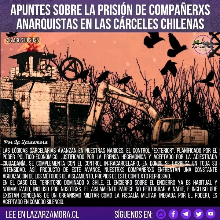 Las lógicas carcelarias avanzan en nuestras narices, el control «exterior», planificado por el poder político-económico, justificado por la prensa hegemónica y aceptado por la adiestrada ciudadanía, se complementa con el control intracarcelario, en donde se expresa en toda su intensidad. Así, producto de este avance, nuestrxs compañerxs enfrentan una constante agudización de los métodos de aislamiento, propios de este contexto represivo.