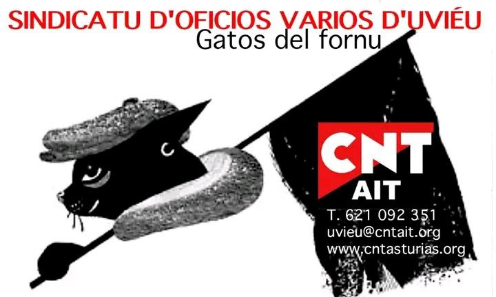 Arranca el Sindicatu d’Oficios Varios d’Uviéu – Asturies El Sindicatu d’Oficios Varios d’Uviéu ‘Gatos del Fornu’, adherido a la CNT-AIT, echa a andar este 1 de octubre como tal en la zona centro de Asturies (Uviéu y Cuencas). Nace de la agrupación de los antiguos grupos de Uviéu y Mieres. Tendrá su sede en los locales de L’Arcu la Vieya (Postigo Alto, 16 de Uvieu), aunque también se puede contactar en el tfno 621 092 351 o a través del correo uvieu@cntait.org El Sindicato ofrecerá a trabajadores y trabajadoras de Uviéu, su entorno y las cuencas mineras, apoyo sindical y jurídico, si llega el caso. Las consultas para temas laborales, sociales o de otro tipo pueden hacerse el segundo viernes de cada mes, de 17 a 20 horas en el citado local del Arcu la Vieya. Sigue