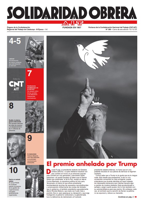 Ya está en la calle el nuevo número de Solidaridad Obrera, el periódico de la Confederación Nacional del Trabajo de Catalunya, adherida a la Asociación Internacional de los Trabajadores.