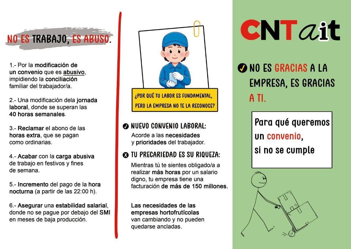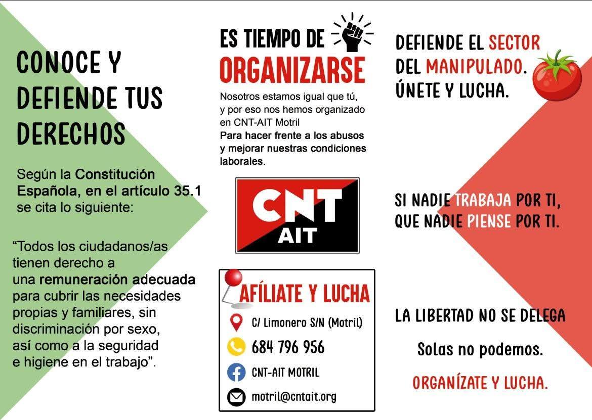 CNT AIT Motril , no acepta , el acuerdo de los sindicatos verticales , activamos nuestra Acción Directa , reparto de Flyers , convocatoria de huelga e inspecciones de trabajo… Se vulnera el convenio y los acuerdos tomados son insuficientes , a la vez de igual de precarios.