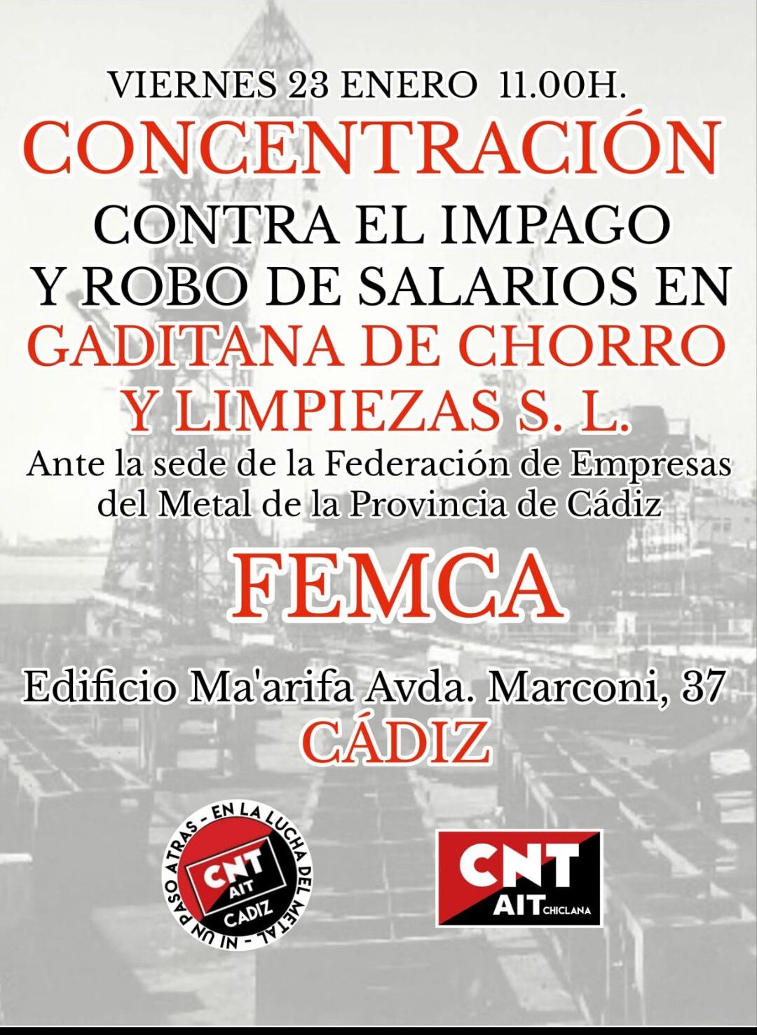 GADITANA DE CHORRO Y LIMPIEZAS S.L., aún mantiene a 55 trabajadorxs en nómina, repartidos en la Base Naval de Rota [Navantia], y en su taller de Tres Caminos en Puerto Real.