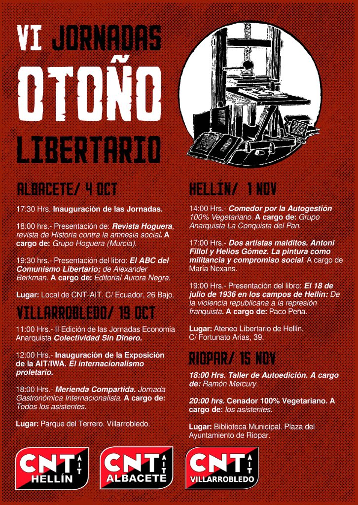Las actividades comenzaran el próximo día 4 de octubre a las 17:30 hrs. en Albacete, en el local de la CNT-AIT, se inaugurarán las Jornadas de Otoño Libertario y se dará comienzo a las 18:00 hrs. con la presentación de dos proyectos editoriales. El primero de ellos: la Revista Hoguera 2# (Murcia) y después el libro El ABC del Comunismo Libertario; a cargo de la Editorial Anarcosindicalista Aurora Negra.