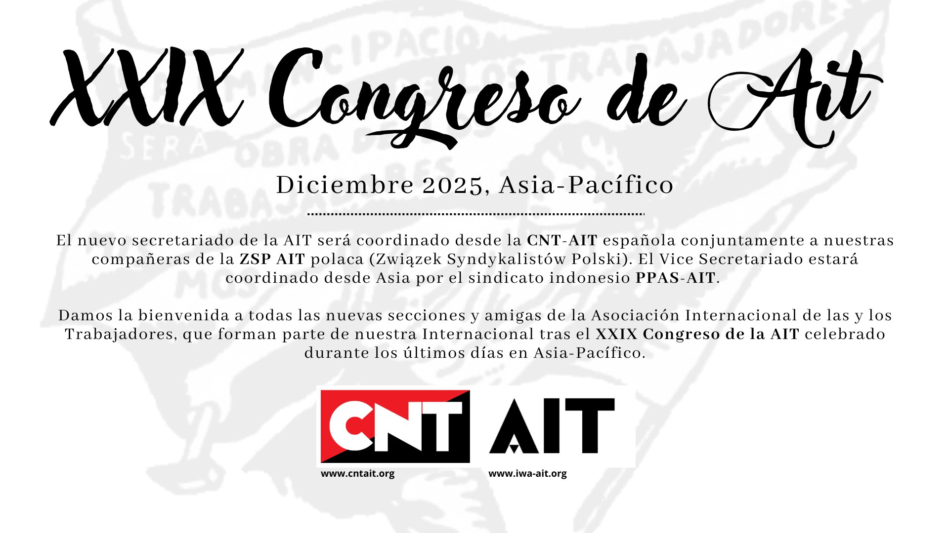 El nuevo secretariado de la AIT será coordinado desde la CNT-AIT española conjuntamente a nuestras compañeras polacas de la ZSP-AIT (Związek Syndykalistów Polski). El Vice Secretariado de la AIT estará coordinado desde Asia por el sindicato indonesio PPAS-AIT. Sigue leyendo
